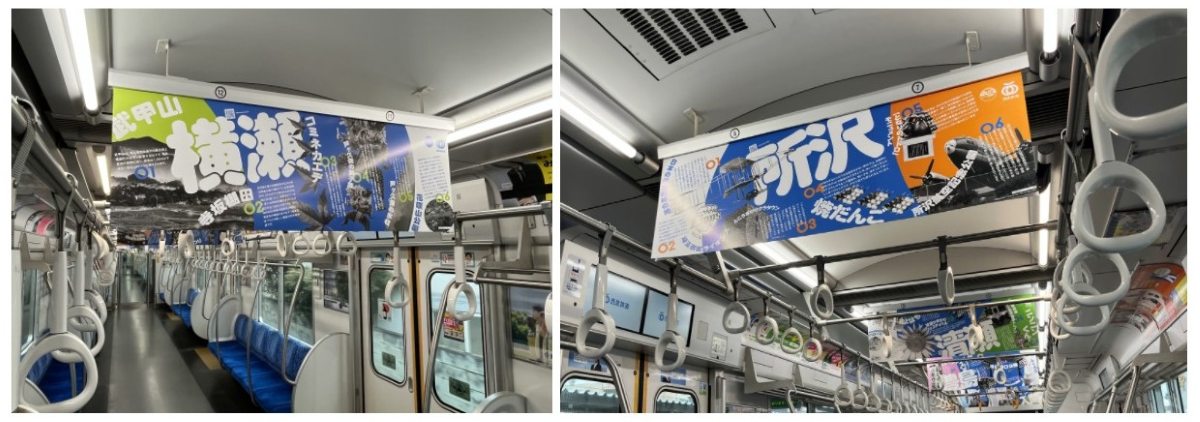 さらに車内も特別仕様です。全車両の中づり広告が、沿線10自治体(豊島区・練馬区・西東京市・東久留米市・清瀬市・所沢市・入間市・飯能市・横瀬町・秩父市)のポスターで彩られています。各自治体の観光スポット、文化財、特産品、祭りなどがテーマとなっており、車内全体が「沿線の魅力を巡るギャラリー」のように仕上がっています。
