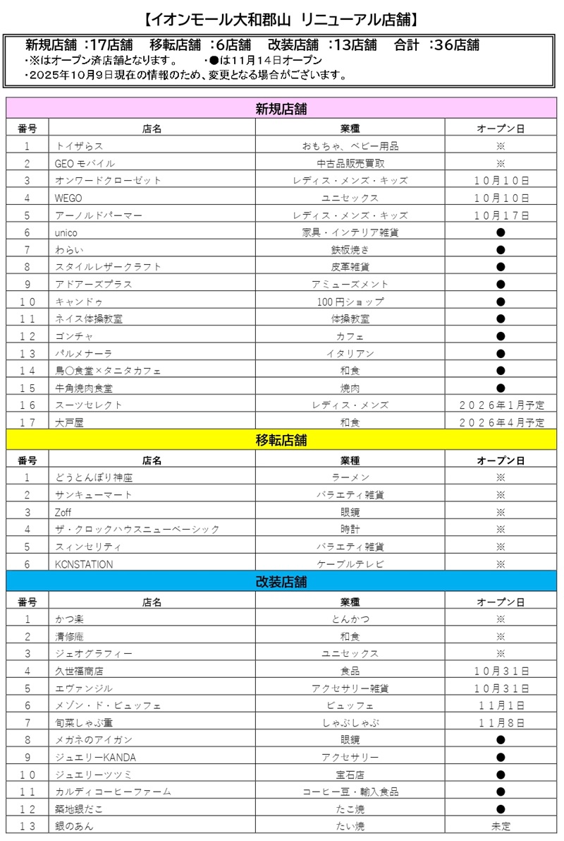 「イオンモール大和郡山」リニューアル店舗一覧(新規17店、移転・改装36店)