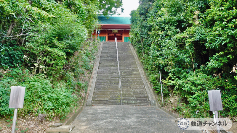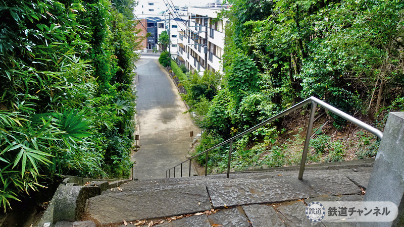階段を登り切って下を見ています。参道横の集合住宅と比べても4階くらいの高さです。