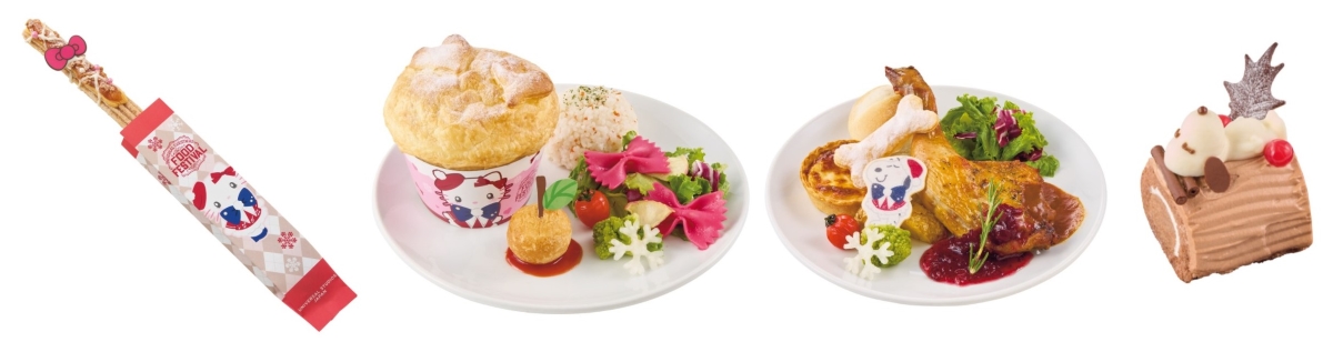 例えば、「ハローキティ」の大好物であるりんごをイメージした「ドルチェ・チュリトス ~アップルパイフレーバー~」(下写真の1番左)は、手軽な食べ歩きにもぴったり。心温まる「ポットパイ ~ホタテとエビのチャウダー~」(下写真の左から2番目)や、骨型パイが印象的なスヌーピーモチーフの「ローストチキン ~デミグラス&ベリーソース~」(下写真の右から2番目)などが提供されます。スヌーピーがケーキの上に寝転がるスヌーピーが寝転がっている「ブッシュ・ド・ノエル ~ショコラ&マロン~」(下写真の1番右)は、かわいさ満点のケーキです。
