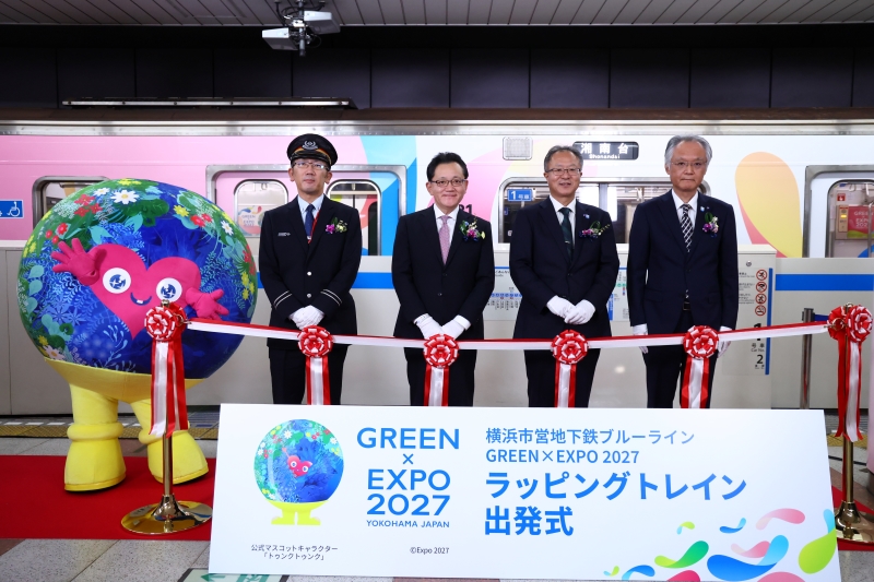 横浜市営地下鉄が「GREEN×EXPO 2027」仕様に! ブルーラインで出発式開催、マスコット「トゥンクトゥンク」も登場