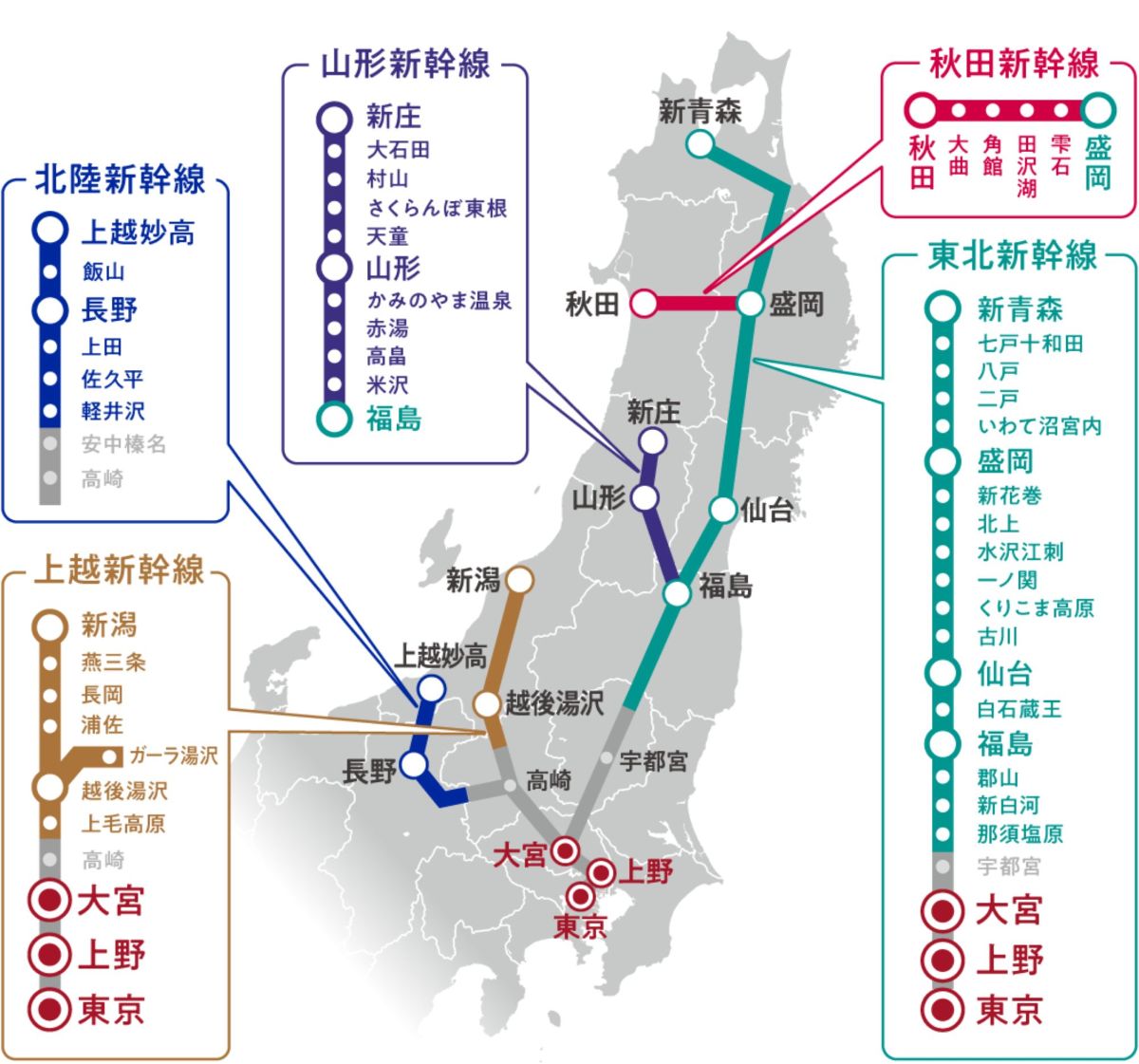 出発駅は東京駅、上野駅、大宮駅のいずれか。行き先候補となるのは、東北新幹線(新青森まで)、秋田新幹線(秋田まで)、山形新幹線(新庄まで)、上越新幹線(新潟まで)、北陸新幹線(上越妙高まで)の各駅です。