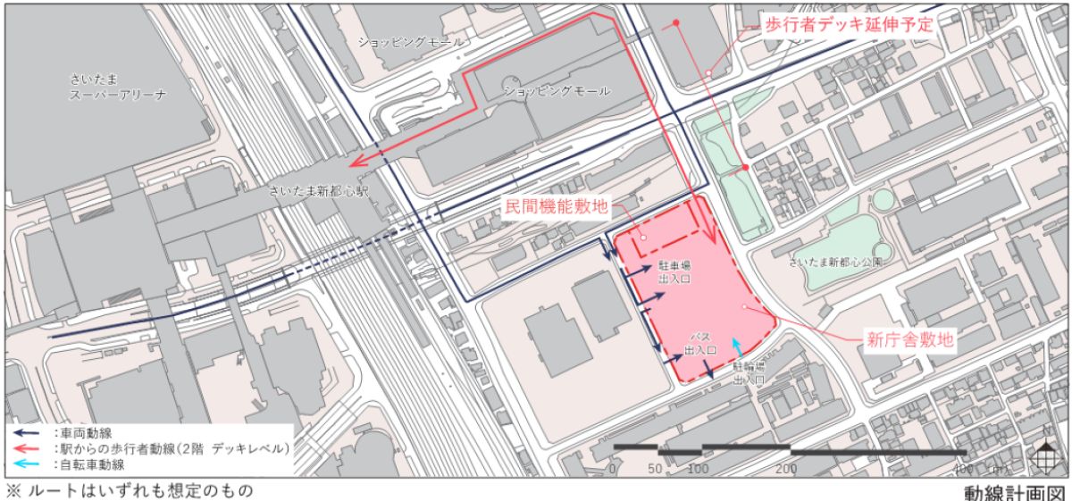 新さいたま市本庁舎の計画地は。大宮区北袋町の「さいたま新都心駅東口バスターミナル街区」で、現機能の整理を前提に新庁舎を配置します。JRさいたま新都心駅からは、歩行者デッキ延伸で繋がり、徒歩8分ほどになる予定です。概算事業費は、2025年10月時点で、約700億円(調査・設計費 約25億円、本体工事費 約640億円、移転費 約35億円)と試算しています。