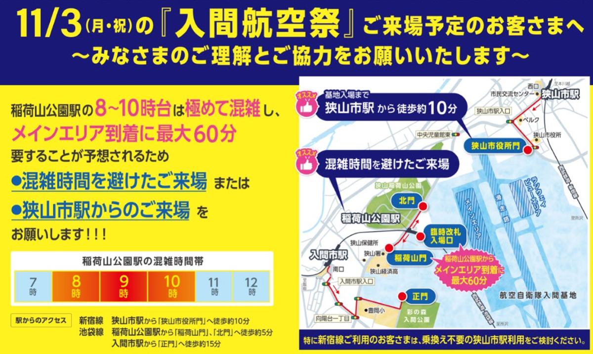 今年の入間航空祭は、開催時間が8:00~13:00となるため、最寄り駅の稲荷山公園駅は8時から10時台の3時間が特に混雑することが予想されます。その為、混雑予想時間帯を避けての来場を呼び掛けると共に、西武鉄道では以下の様に、特に西武新宿線が利用できる方へは、狭山市駅の利用を案内しています。