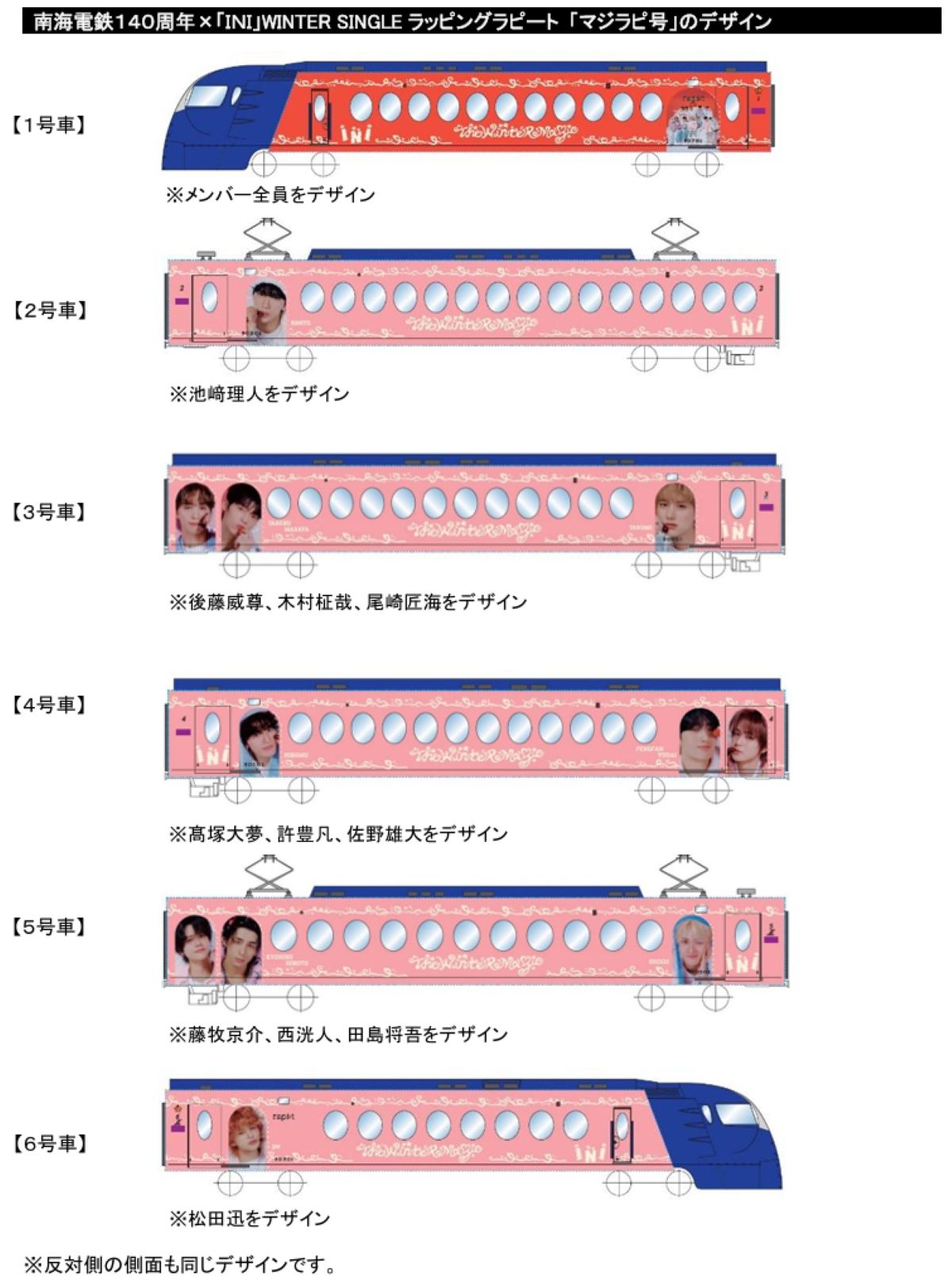 (4) ラッピング内容:特急ラピート(50000系)1編成6両を、「INI」のWINTER SINGLE『THE WINTER MAGIC』とコラボしたデザインのラッピングを施して運行します。