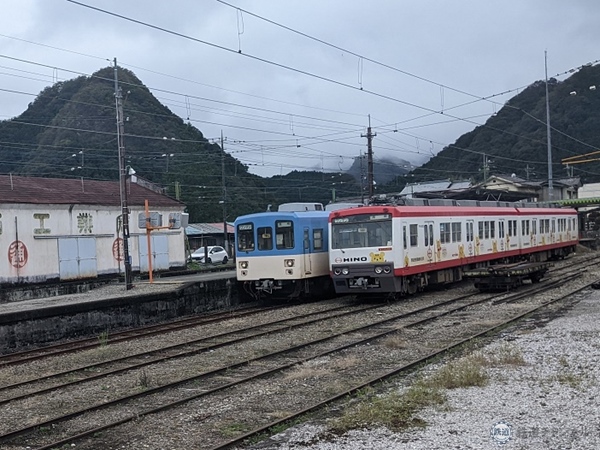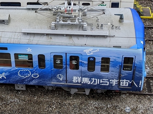 IHI(旧社名・石川島播磨重工業)グループの宇宙ベンチャー企業で、上信線沿線の富岡市に本社を置くIHIエアロスペースの特別塗装車で、2025年10月にデビューしたばかり。タネ車のデハ500形は元西武の新101系電車です。車体に描かれた「群馬から宇宙へ」が夢をかき立てます。
