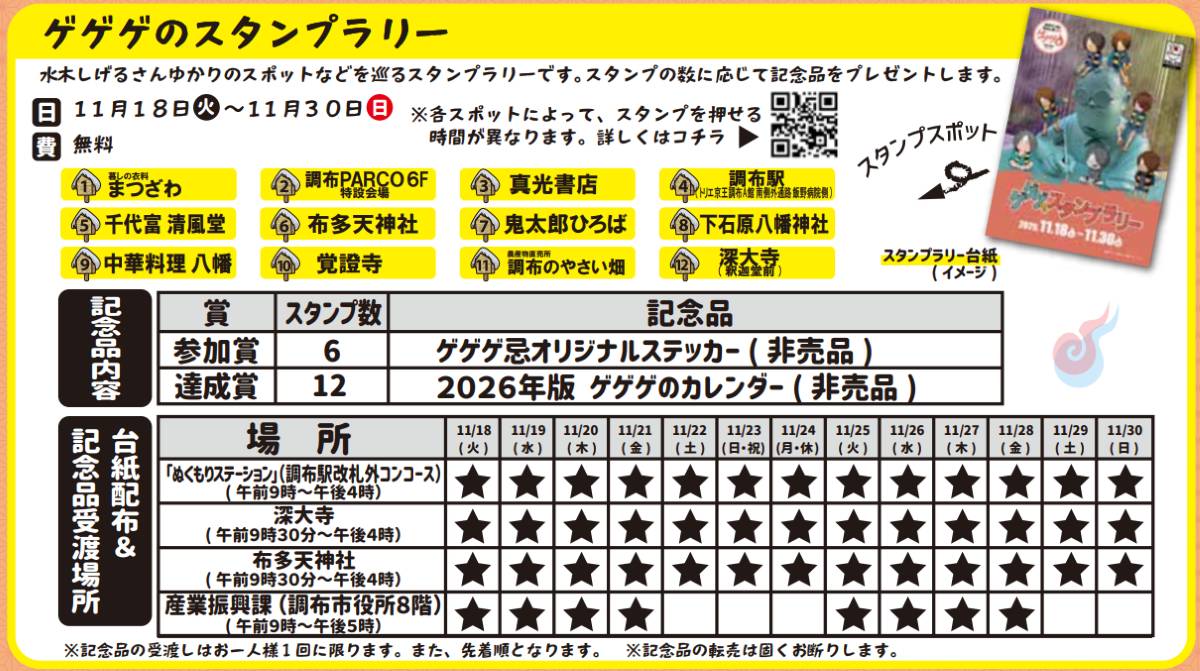 期間中、水木しげるさんゆかりのスポットなどを巡るスタンプラリーが開催されます。スタンプを6個以上集めると参加賞として「ゲゲゲ忌2025オリジナルステッカー」が、12個集めると達成賞として「2026年版ゲゲゲのカレンダー」が贈呈されます(いずれも非売品)。記念品はなくなり次第終了となります。