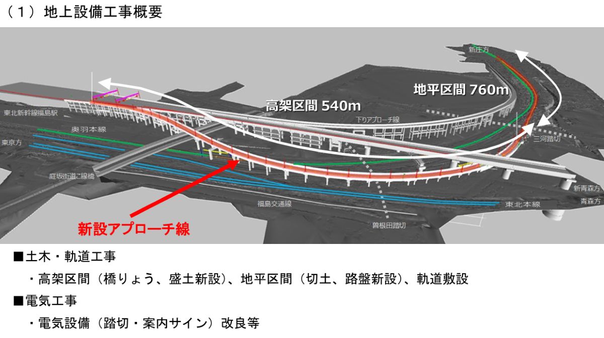 計画では地平区間約760メートルと高架区間約540メートルからなる上りアプローチ線を新設し、奥羽本線と新幹線上りホームを直接結びます。