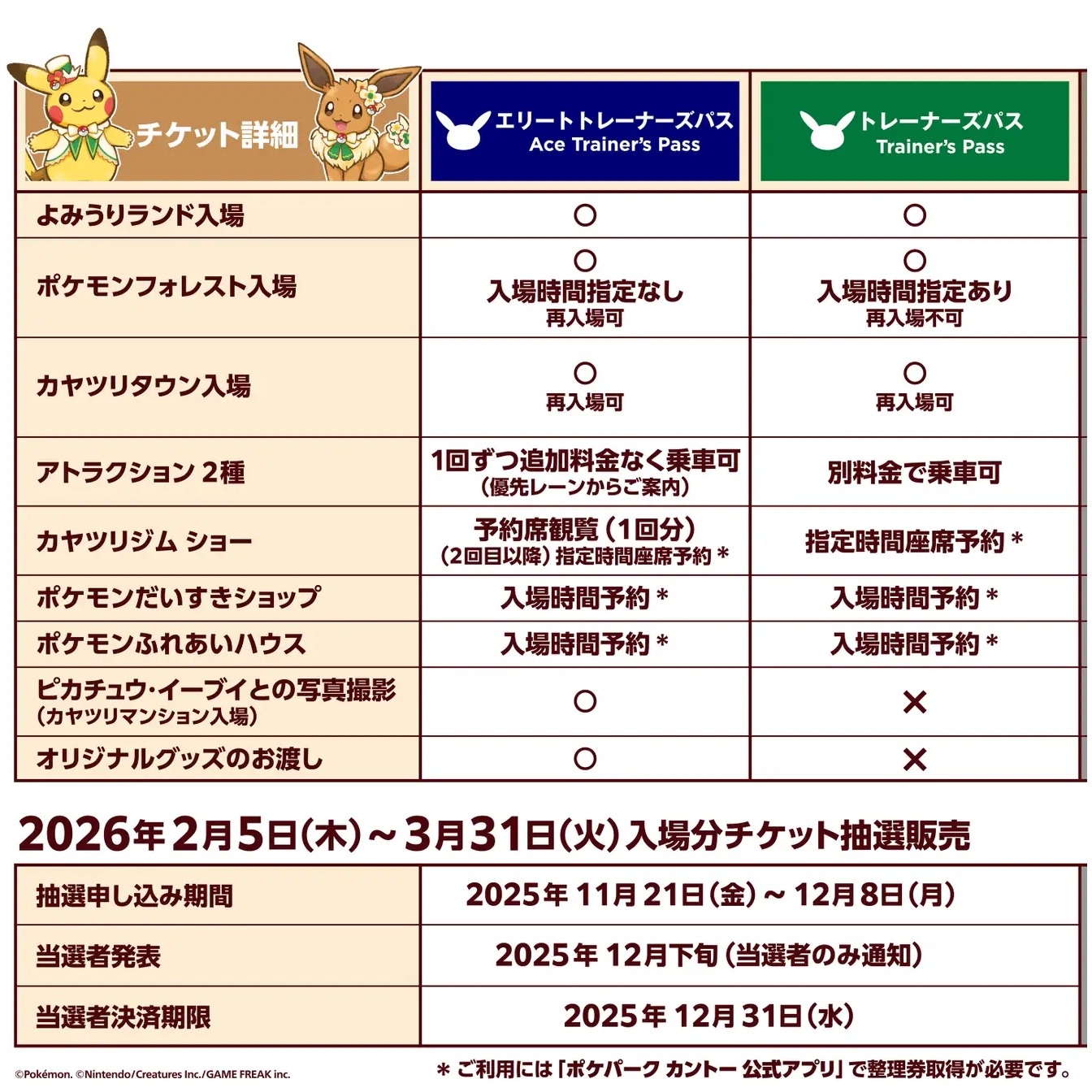 チケットは『ポケパーク カントー』公式サイトにて、2025年11月21日(金)18時から抽選販売の申し込みが開始されます。