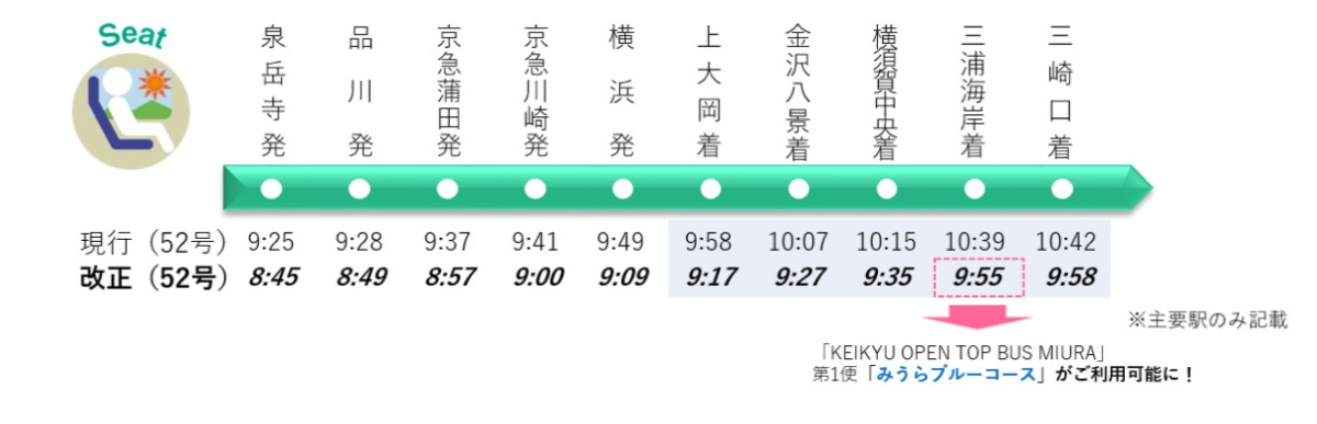 改正後の52号は、泉岳寺駅を8:45に発車し(現行9:25発)⇒三浦海岸駅に9:55着(現行10:39着)⇒終点の三崎口駅には9:58に到着します(現行10:42着)。