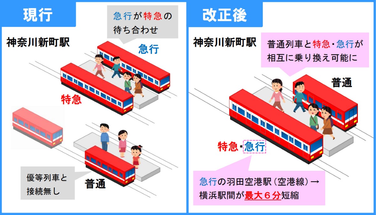 土休日の朝時間帯(7時台~8時台)において、下り方面の急行列車の待ち合わせ駅が、現在の神奈川新町駅から「金沢文庫駅または上大岡駅」に変更されます。これにより、羽田空港駅(空港線各駅)から横浜駅間の急行列車の所要時間が最大6分短縮されます。