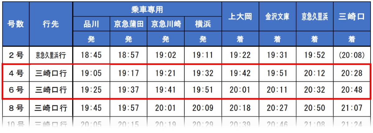 平日は「イブニング・ウィング号」の一部列車が行先を三崎口まで延長。土休日は横須賀・三浦方面の「ウィング・シート」の運行時間を繰り上げ、三浦海岸駅での観光バスへの接続を改善します。また、土休日の朝は急行列車の待ち合わせ駅変更により、羽田空港駅~横浜駅間の所要時間を最大6分短縮します。