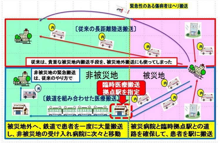 これまでDMATをオンレール輸送する発想はありませんでしたが、鉄道に知見を持つ早稲田大学の梅津光生名誉教授(医療レギュラトリーサイエンス研究所顧問)が医師や看護師の鉄道利用を発案しました。