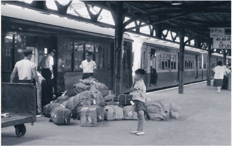 大船駅でのショットに写るのは、70系電車に併結された荷物電車(クモニ13)への荷物積み卸し風景。荷さばきの様子を熱心に見詰める当時8歳の少年こそ、幼い日の梅津先生でした。