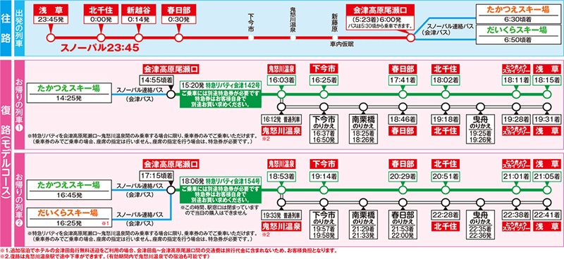 「スノーパル23:45」とは、東武鉄道浅草駅を23:45に出発し、翌日の5:23に会津高原尾瀬口駅に到着する、スキー・スノーボード専用の臨時夜行列車のこと。途中、0:00北千住、0:14新越谷、0:30春日部に停車します。会津高原尾瀬口駅からは連絡バスに乗り、6:30頃にたかつえスキー場、6:50頃にだいくらスキー場に到着。ゲレンデの雪景色を眺めながら、まずは朝食タイムにするもよし、早速スキーやスノーボードを楽しむもよし。1日を有効に活用することができます。