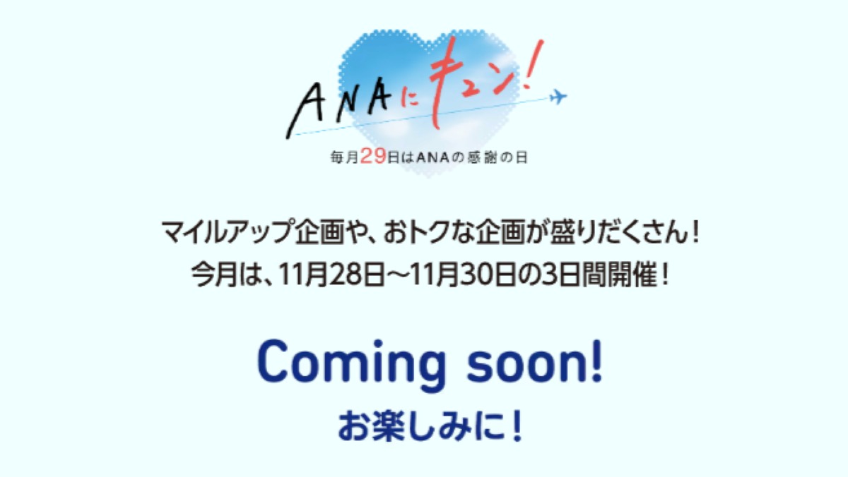 毎月29日限定で開催されている「ANAにキュン!」も、11月はブラックフライデー特別企画として実施されます。今回は、11月28日(金)~30日(日)の3日間、さらに「キュン!」とする航空券やツアーのセールが予定されているとのことです。詳細は11月25日(火)0:00以降に専用ページで公開されます。