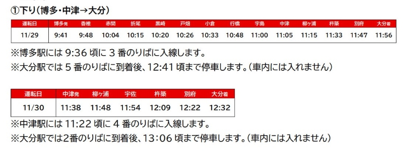 下り:11月29日は博多発(9:41)⇒大分着(11:56)、11月30日は中津発(11:38)⇒大分着(12:32)で運行されます。