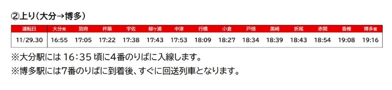 上り:両日とも、大分発(16:55)⇒博多着(19:16)で運行されます。