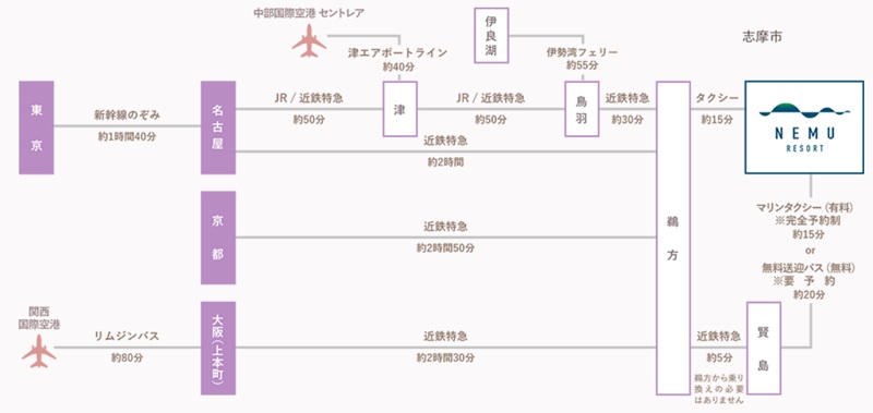 「NEMU RESORT」は、三重県志摩市にあります。東京駅からアクセスする場合、新幹線で名古屋駅まで行き、近鉄特急を乗り継いで志摩の玄関口である、近鉄志摩線「鵜方(うがた)駅」へ。鵜方駅からタクシーで約15分。もしくは近鉄志摩線「賢島駅」から無料送迎バスで約20分(前日までの予約制・当日8:00以降は要電話問い合わせ)です。