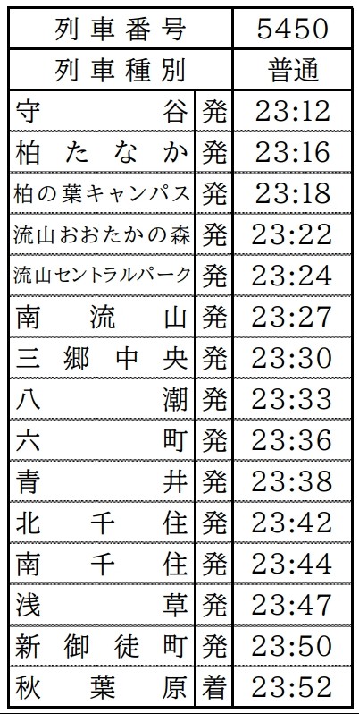 守谷駅を23時12分に出発⇒流山おおたかの森駅を23時22分⇒北千住駅を23時42分に発車⇒終点の秋葉原駅には23時52分に到着。日付が変わる前に秋葉原へ着けるので、そこからの乗り換えや移動にも余裕が持てそうです。