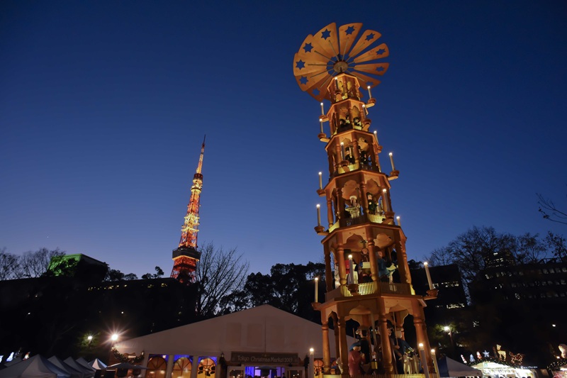 御成門駅近くの芝公園会場では、ドイツの伝統的なクリスマスマーケットを開催。こちらにも世界最大級・高さ14メートルのクリスマスピラミッドが登場するほか、ドイツとチェコの国境付近にある「おもちゃの村」として知られる、ザイフェン村のくるみ割り人形のオブジェも必見です。東京タワーを望む絶好のロケーションに再現された、ヨーロッパの街並みを堪能しましょう。