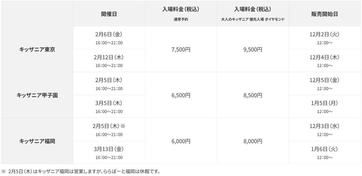 対象年齢は16歳以上。入場時に身分証明書の提示を求められる場合があります。予約は各公式サイトの「ニュース一覧」にある専用ページから申込できます。各施設の開催日程と料金は以下の通りです。