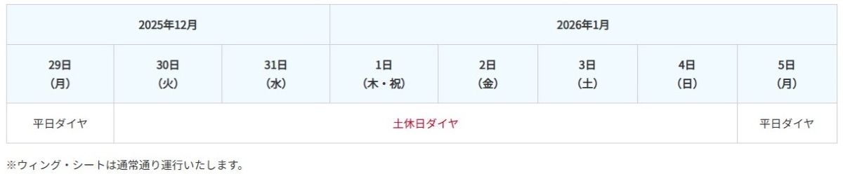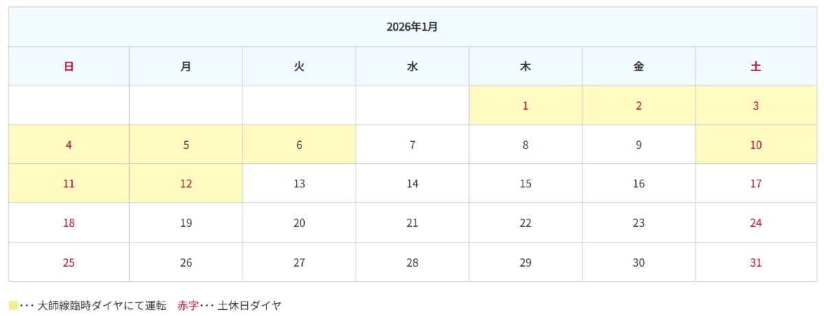 年末年始の土休日ダイヤ運行期間は、2025年12月30日(火)~2026年1月4日(日)です。