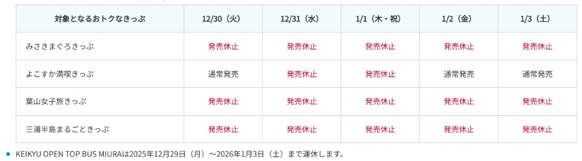 ・「KEIKYU OPEN TOP BUS MIURA」などは運休(12/29~1/3)