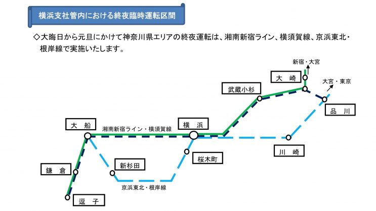 大晦日から元旦にかけて神奈川県エリアの終夜運転は、湘南新宿ライン、横須賀線、京浜東北・ 根岸線で実施されます。