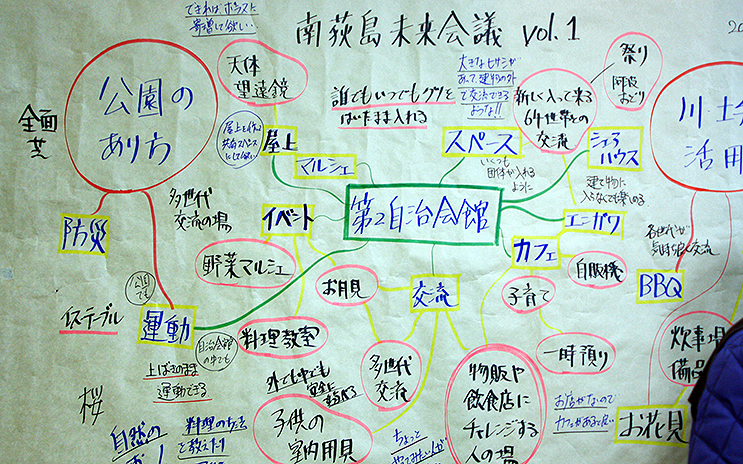 この日も、地域住民たちが集まり、「自分たちの街をどう描いていくか」をミーティング。住民たちの声を集め、コミュニティー拠点のコンセプトワークなどを重ねていた。