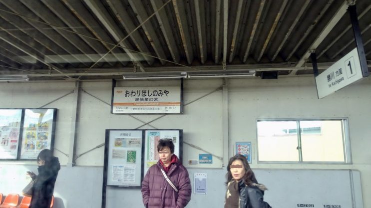 駅名標。1991年(平成3年)勝川からこの駅までが先に開業して、最初は終点駅でしたが、1993年(平成5年)に枇杷島まで開業して全通。駅名に尾張と冠されていますが、他に星の宮という駅が有るワケではありません。JR東海様式の駅名標ですが横棒のオレンジラインが二本線です。