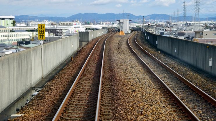 勝川方面の線路はぐんぐん上昇、枇杷島方面は下降。
