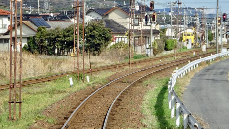 500m程で右(東)にカーブしながら西から来る大社線と列びます。