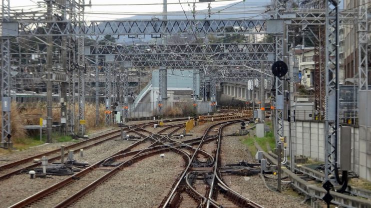 標高14mの小田原駅を出発。2006年(平成18年)まで箱根登山鉄道が直接乗り入れていたので小田原駅まで三線軌条でした。このシザーズ・クロッシングも右側は三線軌条でした。