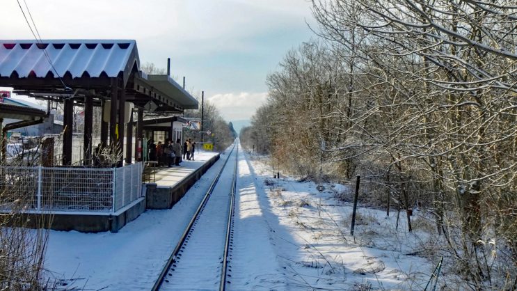 大湊駅を発車します。下北駅に向かって東北東に進みます。完全な逆光ですが、新しいコンデジ(SONY Cyber-shot DSC-WX800)は、WX500時代に悩まされた逆光・斜光時のレンズ・ノイズが出ない様です。何と言ってもこれが逆光時の撮影に大きく寄与してくれます。