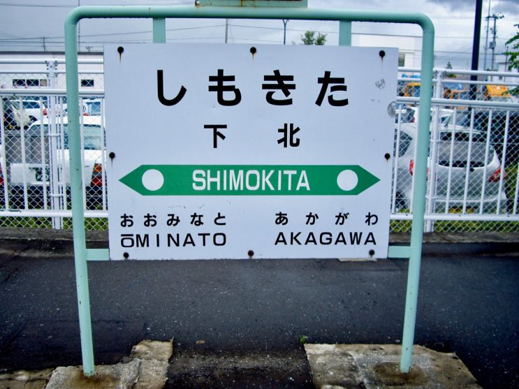 駅予告票。大湊駅から2.9kmで下北駅。