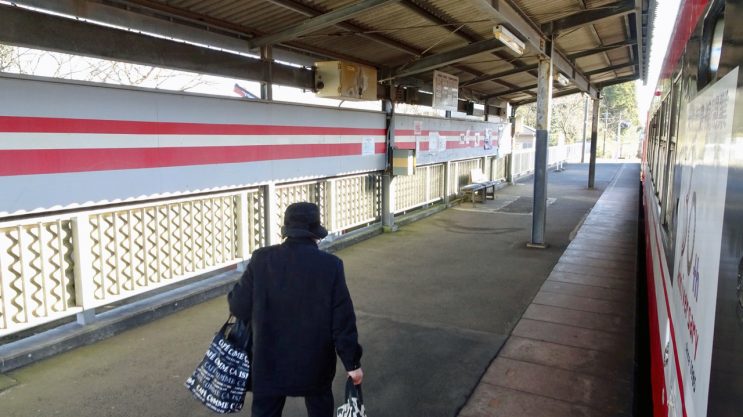 お婆ちゃんが一人降りました。ホームの壁が車両と同じカラーリングで装飾されています。