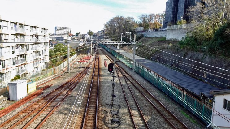 横浜駅側の踏切から東口駅舎と連絡通路を見ていますが、かしわ台駅ホームの跨線橋は見えません。